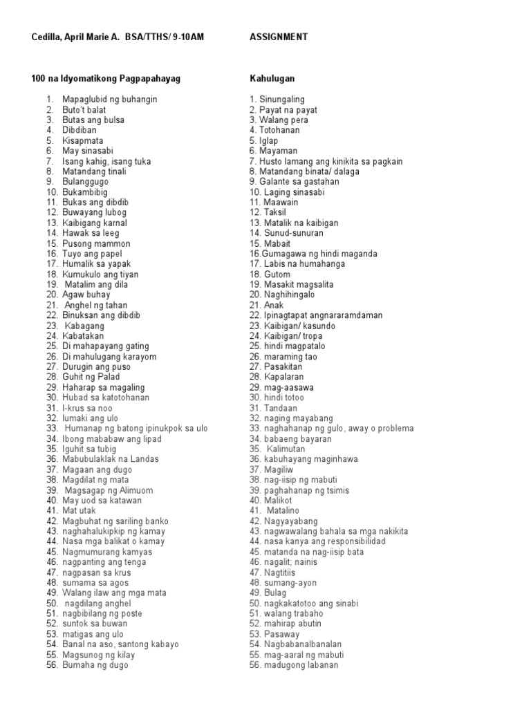 100 Idyomatikong Pahayag At Mga Kahulugan Nito