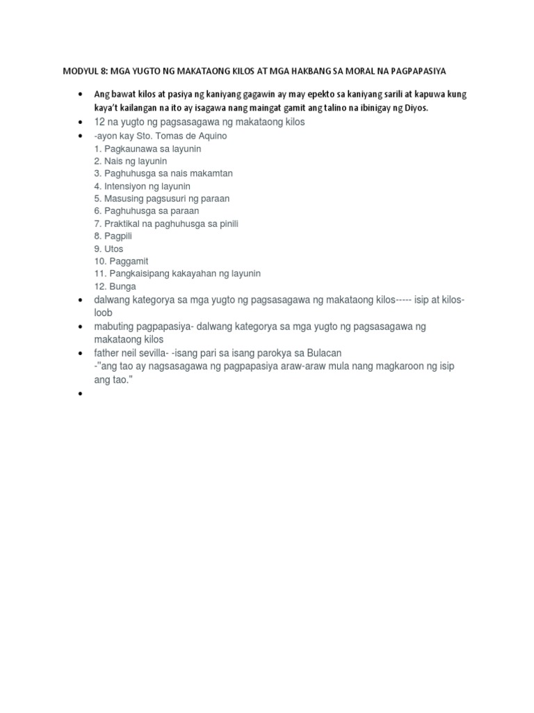Paghuhusga sa nais makamtan 12. Tomas de Aquino may dalawang kategorya ang mga yugto ng makataong kilos. Magbahaginan ng isang sitwasyon sa inyong buhay na kung saan nagpapakita ng iyong kilos.